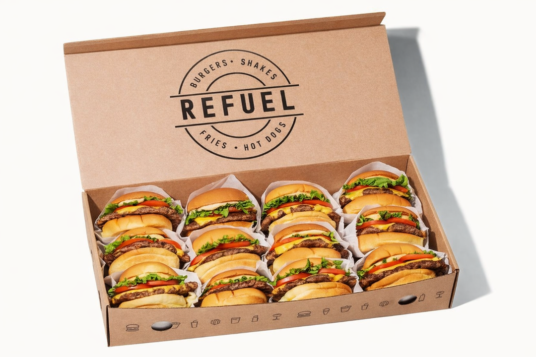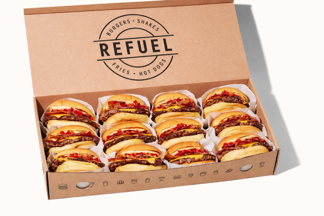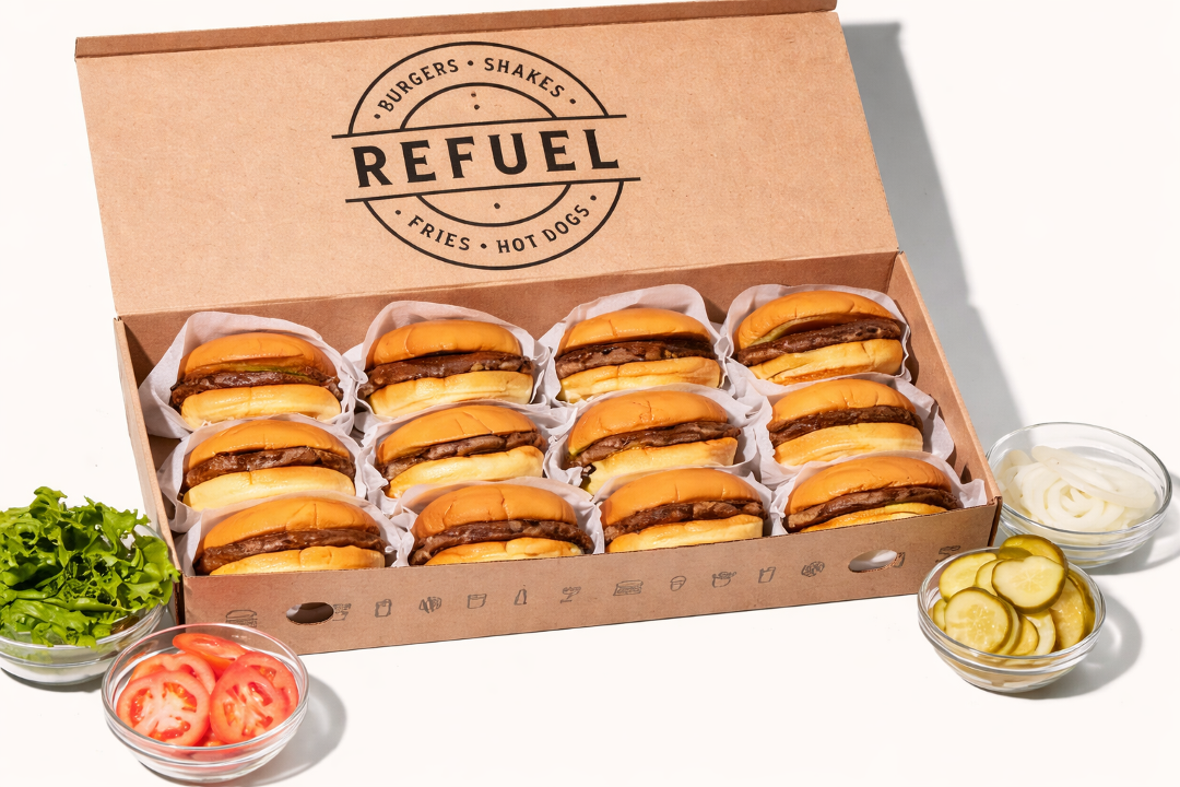 Our signature Refuel Burger- single patty with lettuce, tomato, cheese, and burger sauce. Serves 12. Please allow additional time or order ahead and schedule your order at checkout.