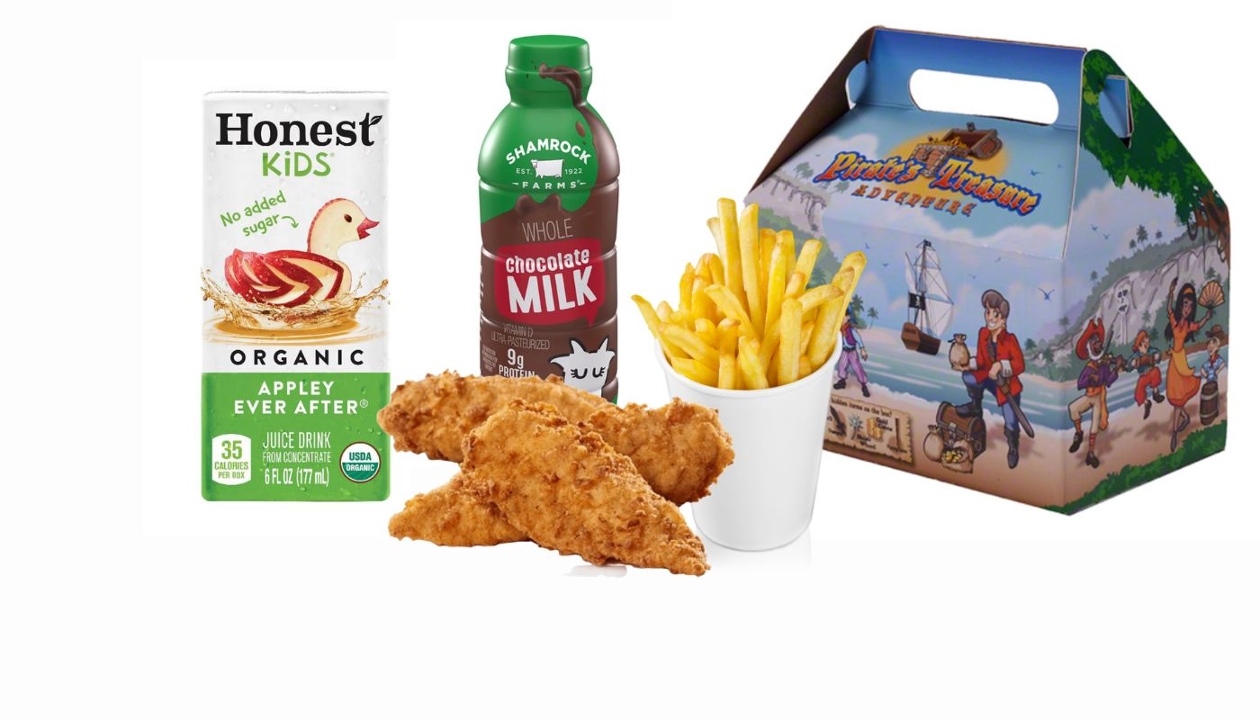 2 Chicken tenders, Small Fries, and Drink choice. Served in a pirate box!