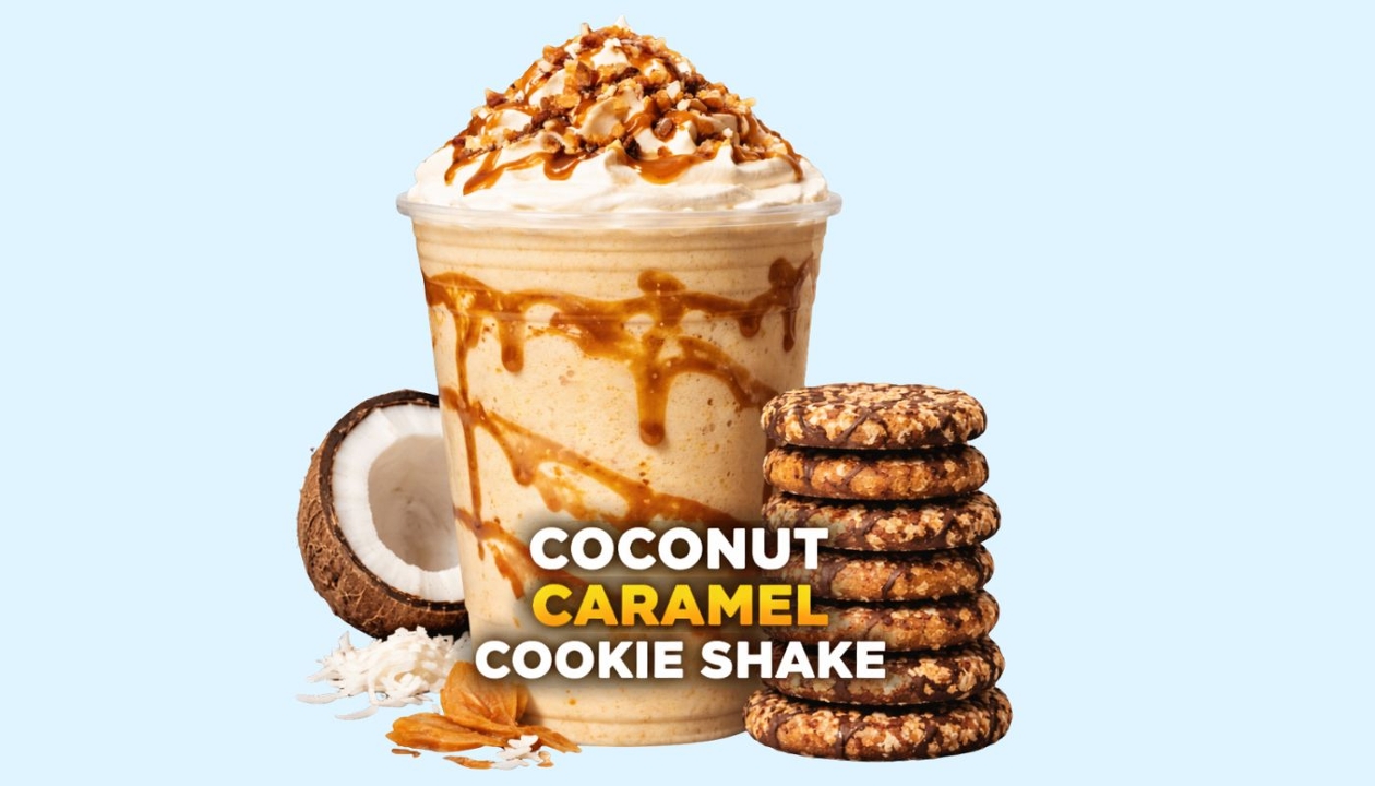 CARAMEL DELIGHT SHAKE Made with Coconut Caramel Cookies blended right into a creamy vanilla shake, swirled with rich caramel, and topped with whipped cream, caramel drizzle, toasted coconut, and cookie crunch.