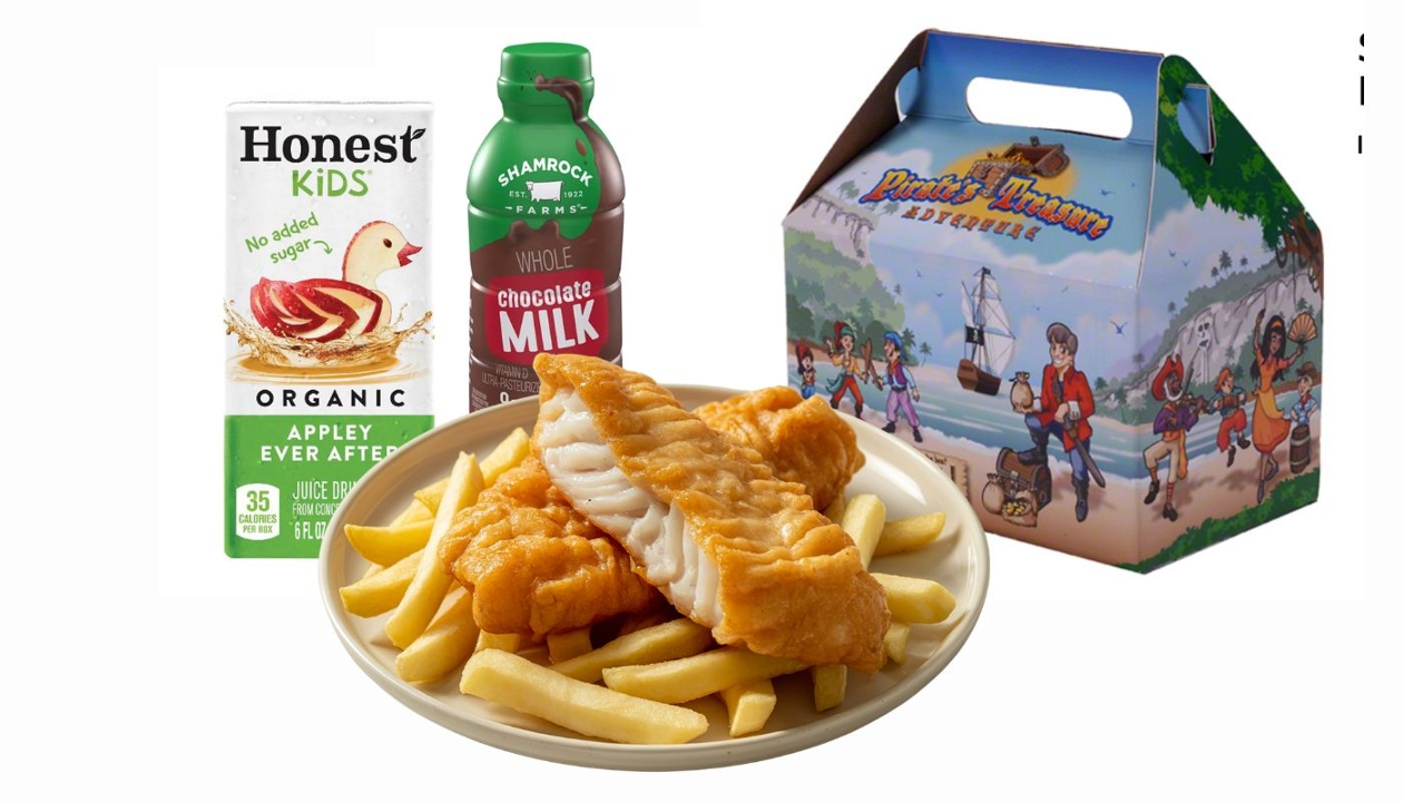 Beer-battered white fish fried to a deep golden crunch, stacked next to our hand-cut fries with house tartar. Crisp outside, flaky inside. Includes a cold drink, juice, or chocolate milk. Served in a pirate box