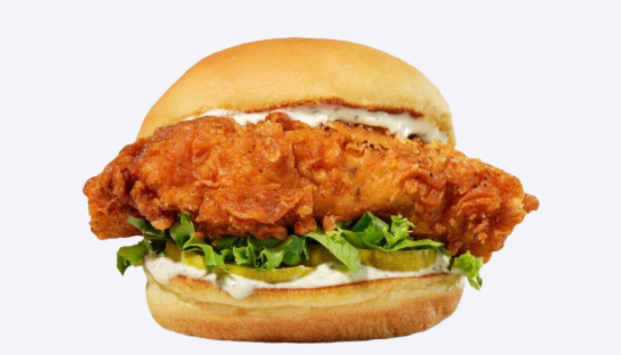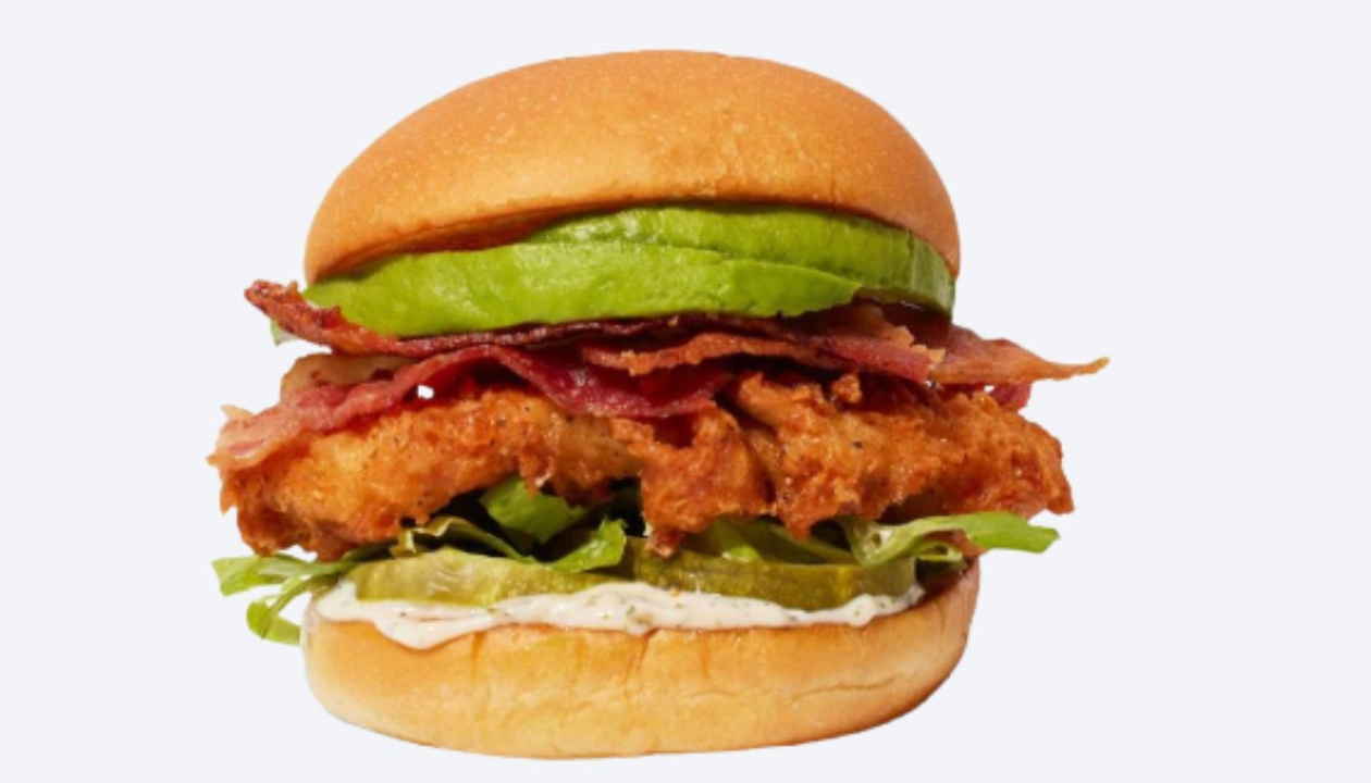 Breaded white-meat chicken breast topped with avocado, applewood-smoked bacon, shredded lettuce, pickles, on a toasted potato bun. Add a fry and a drink at a special price!
