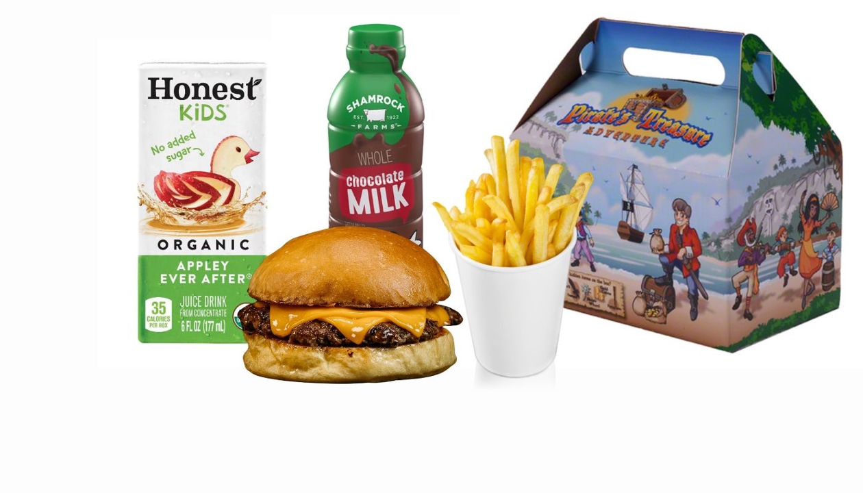 A single patty cheeseburger, small fries, and drink choice. Served in a pirate box!