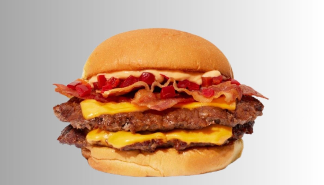 A double patty burger with melted American cheese, applewood-smoked bacon, chopped cherry peppers, and a smokey bbq sauce