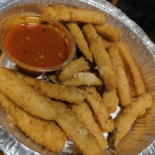 A combination of fried zucchini, mozzarella sticks and chicken breast strips with marinara sauce on the side
