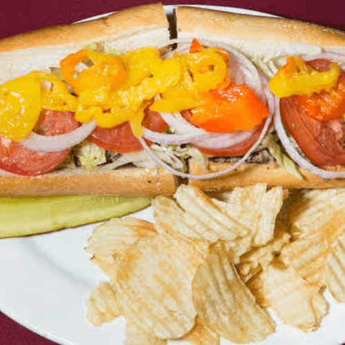 Ham, salami, Provolone, fresh sliced meats and cheeses, roasted peppers, artichoke hearts and eggplant on a bed of lettuce (served with bread)