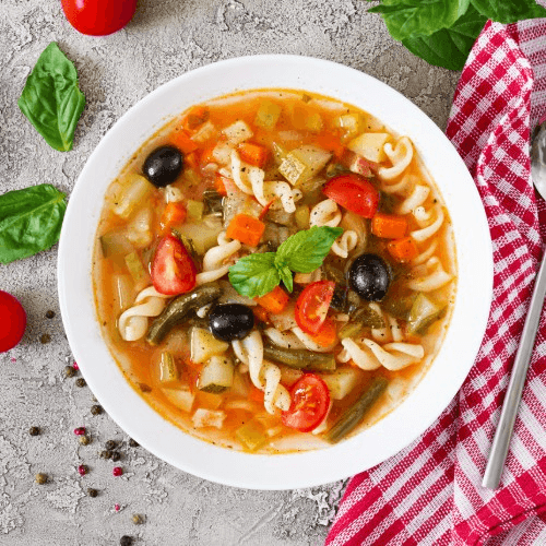 Seasoned broth filled with vegetables, pastina and Romano cheese